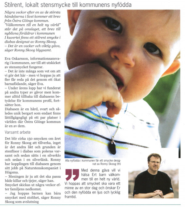 1999 fick jag en förfrågan från Ö. Göinge kommun om jag kunde ta fram förslag på smycke till nyfödda i kommunen. Jag provade mig fram och designade ett diabassmycke i droppform där var och en ändå hade en unik form. I över 20 år levererade jag c:a 150 smycken om året. Jag är stolt över att jag blev utvald till detta projekt.